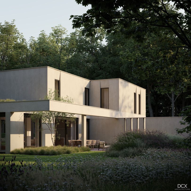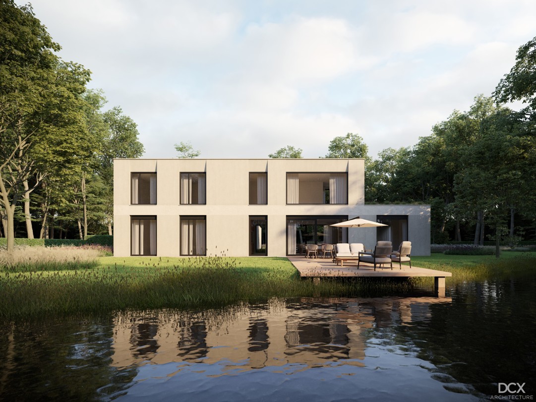 De woning is modern vormgegeven met 2 bouwlagen en een plat dak, voorzien van doorlopende horizontale lijnen, afgewisseld met verticale raampartijen.