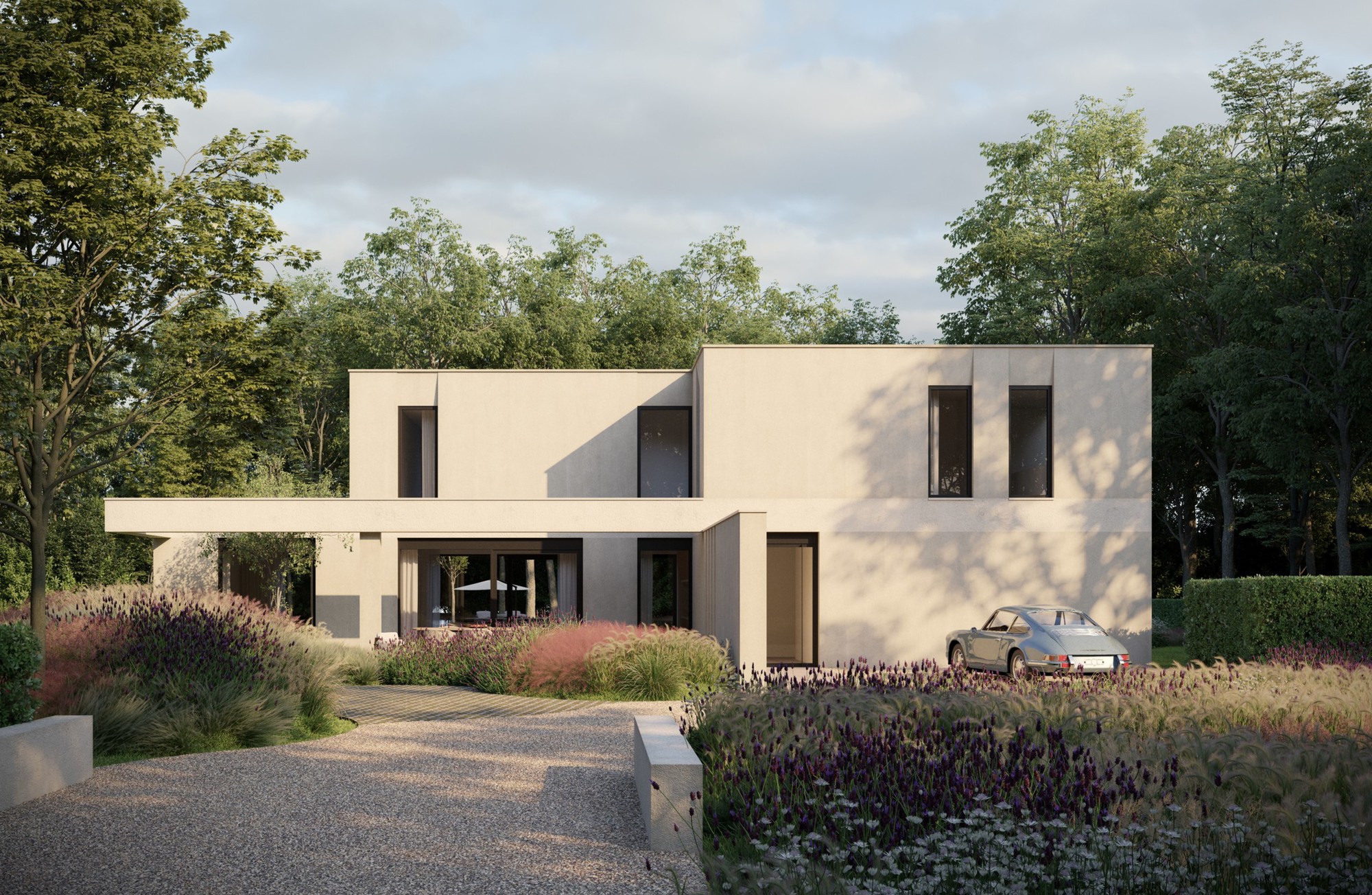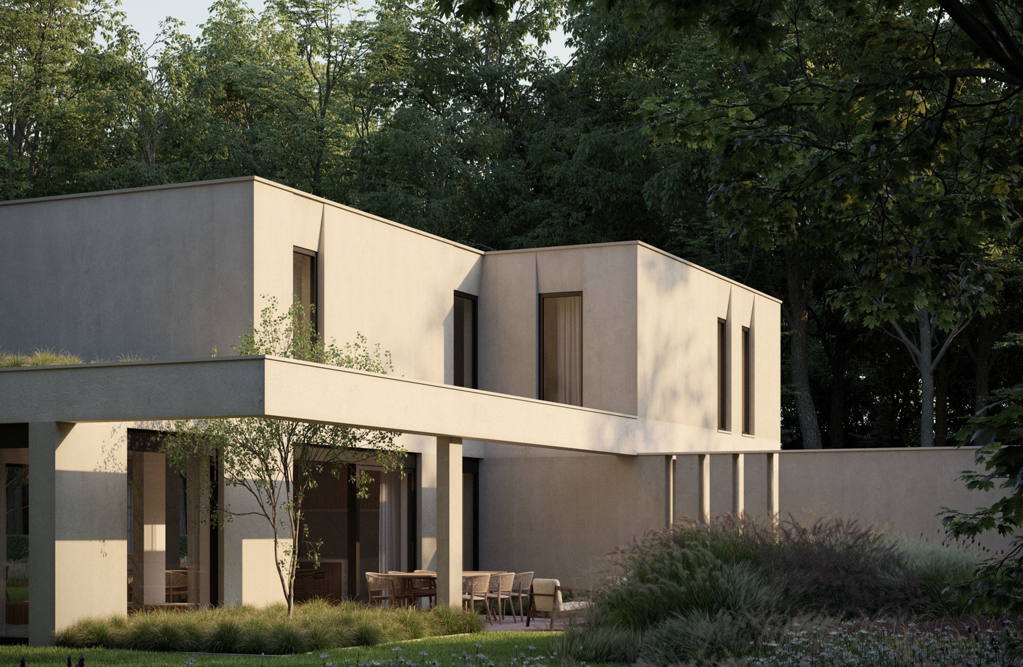 Vanuit zowel het verzonken salon alsook de hoofdslaapkamer ontstaan prachtige gekaderde zichten. Binnen en buiten lopen door met terrassen aan alle zijden.
