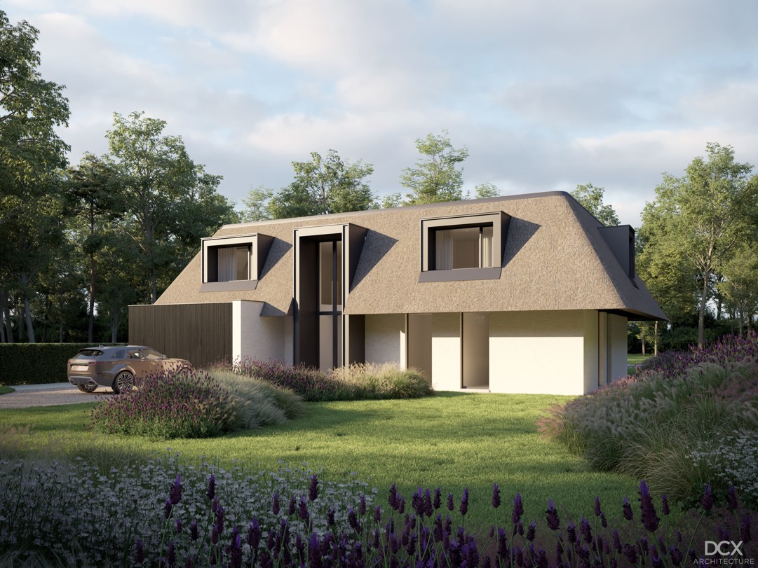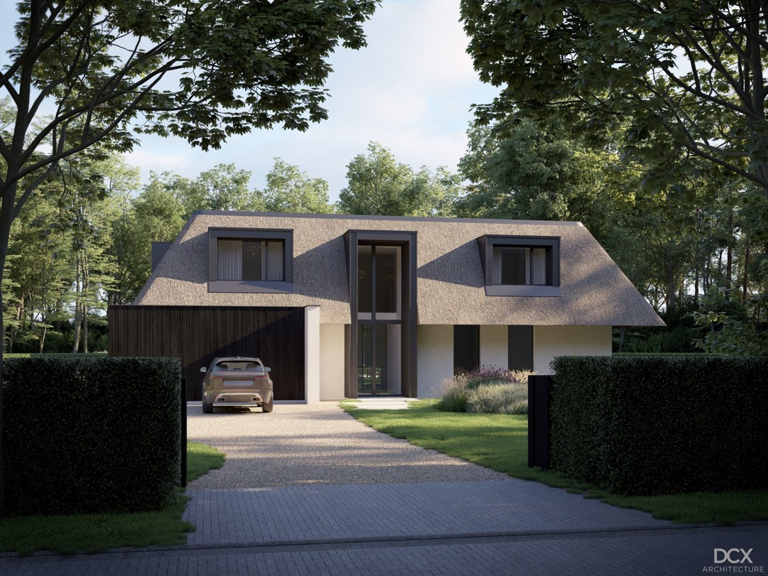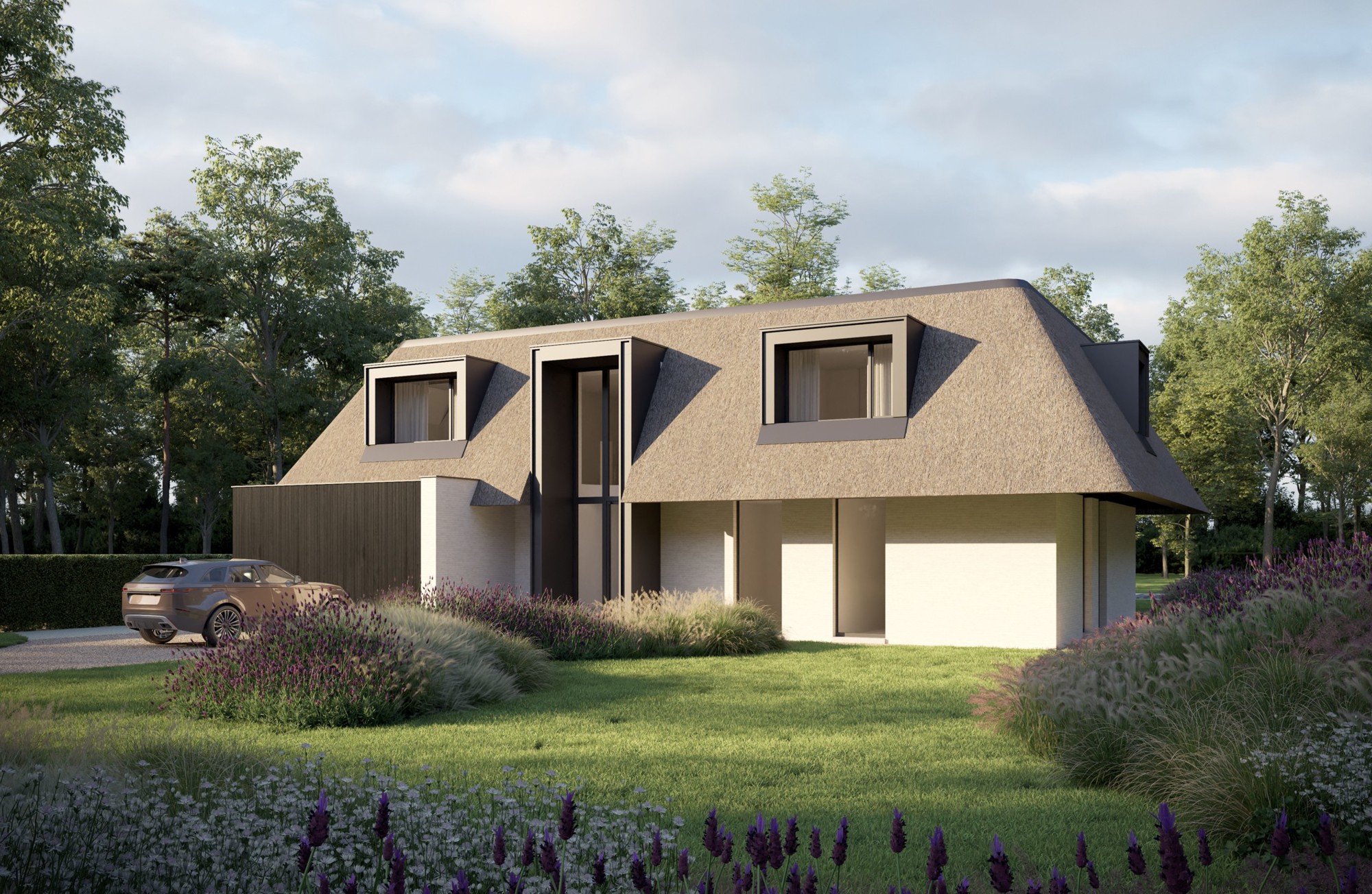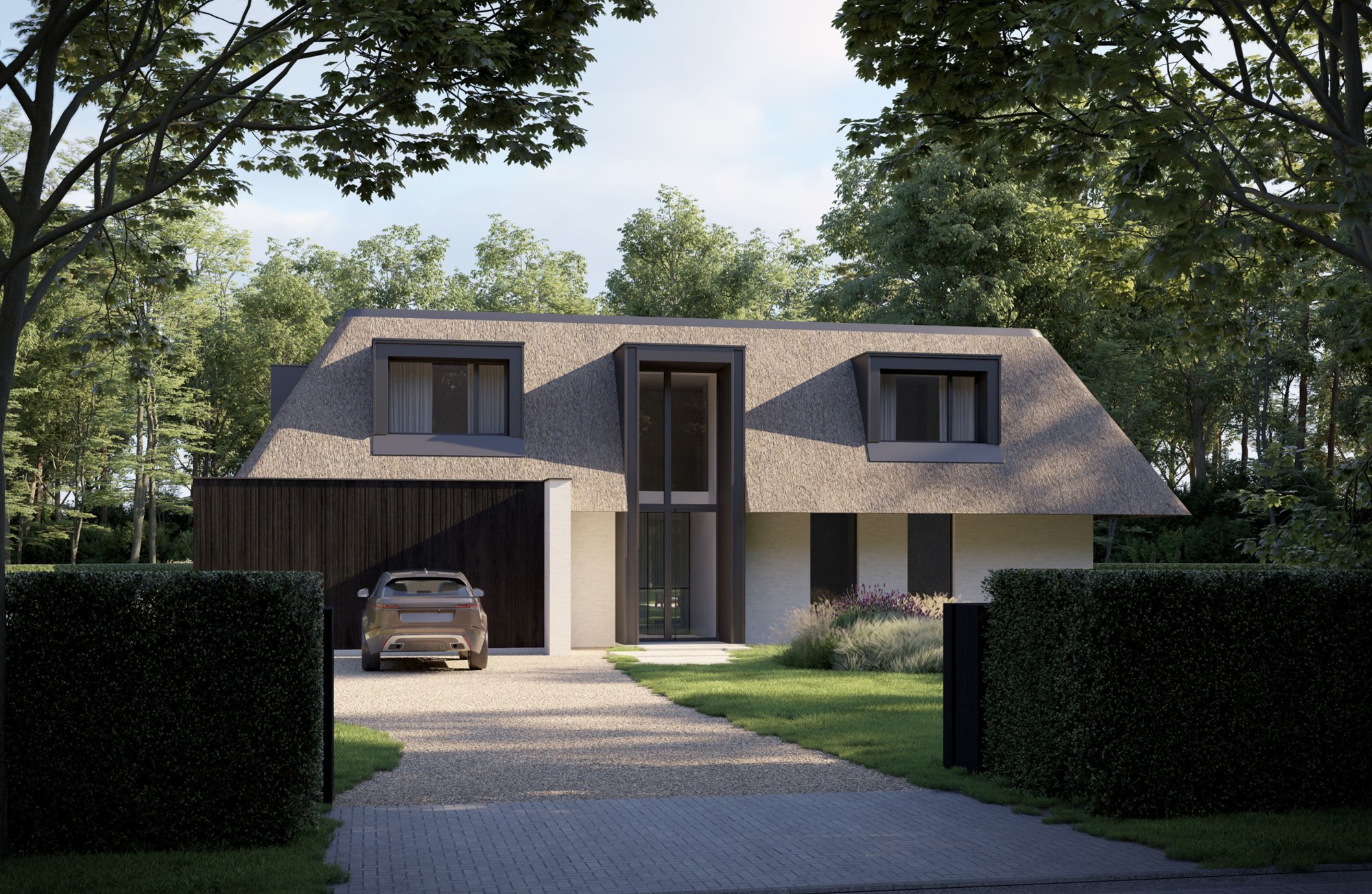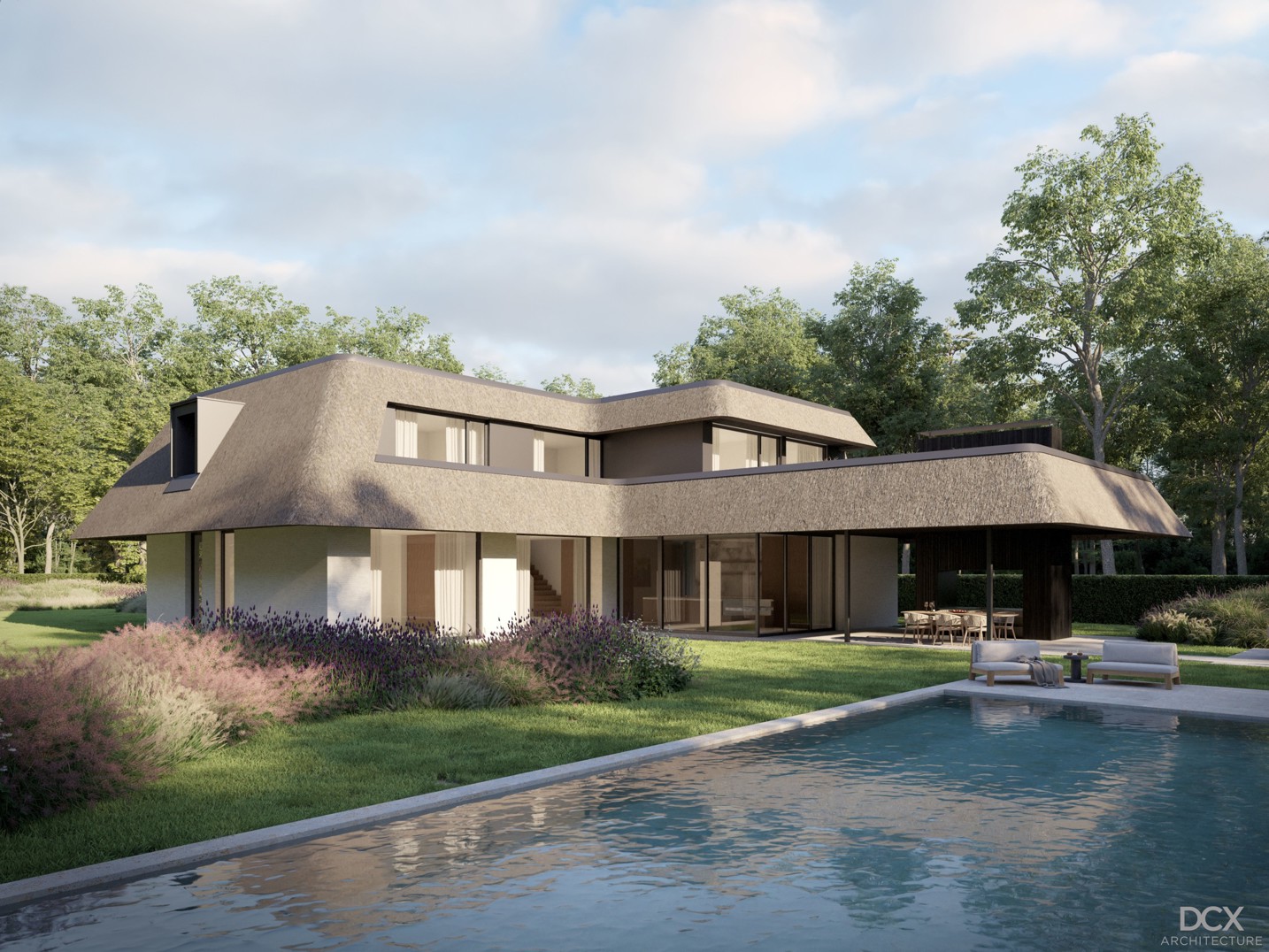 Parkvilla in moderne rietkap-architectuur met unieke buitenkamer, zitput en dakterras.
