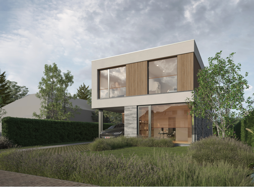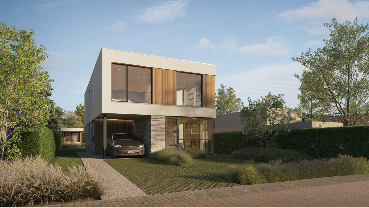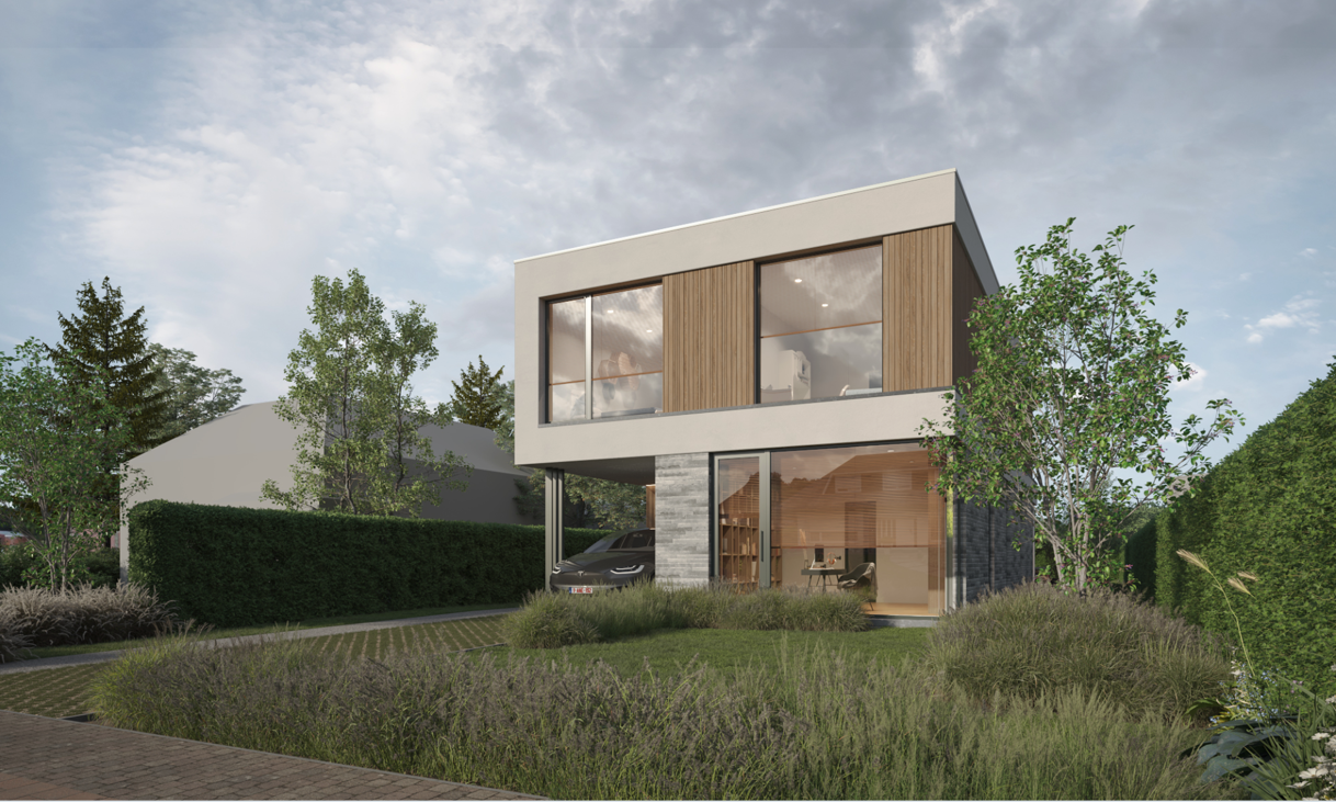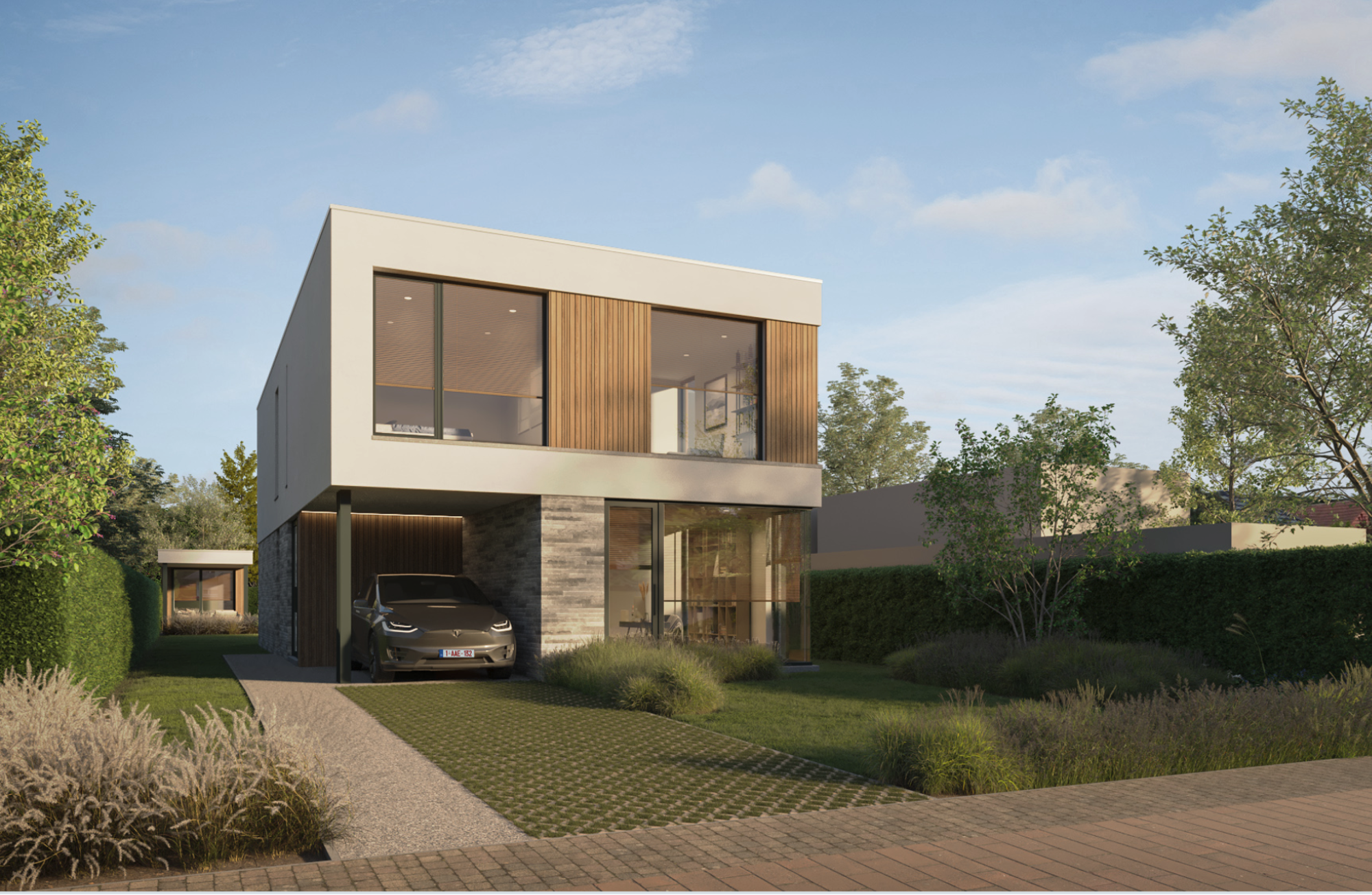 Vrijstaande nieuwbouwwoning te Heist-op-den-Berg, opgevat als een stenen sokkel met strakke U-vorm in gevelpleister als bovenverdieping. De houten beplanking als accent voegt warmte toe aan de woning die voorzien is van grote verticale raampartijen aan alle zijdes.