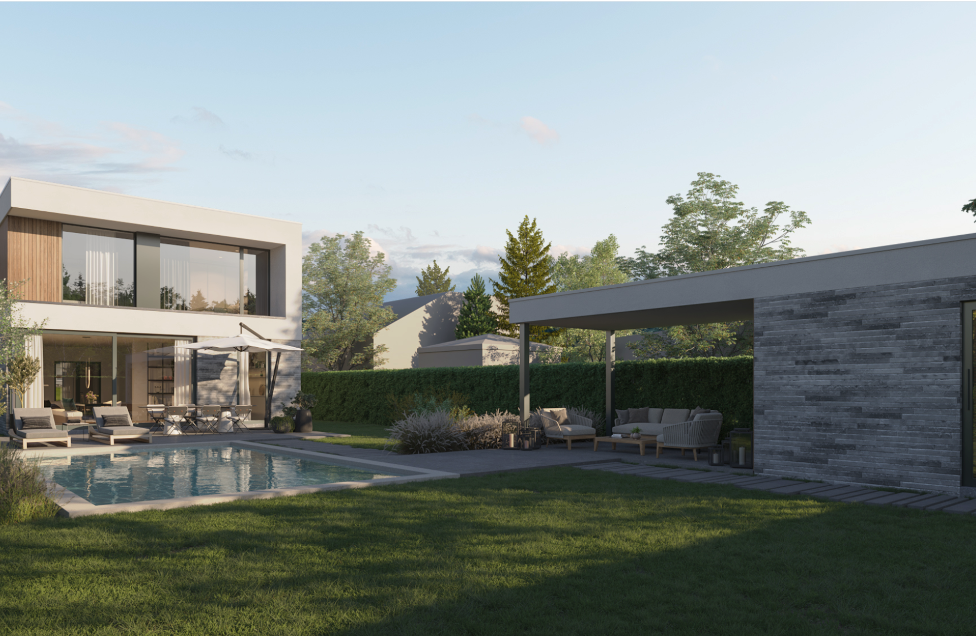 Het architecturale concept wordt ook doorgetrokken naar het poolhouse en de aansluitende leefterrassen met zwembad.
