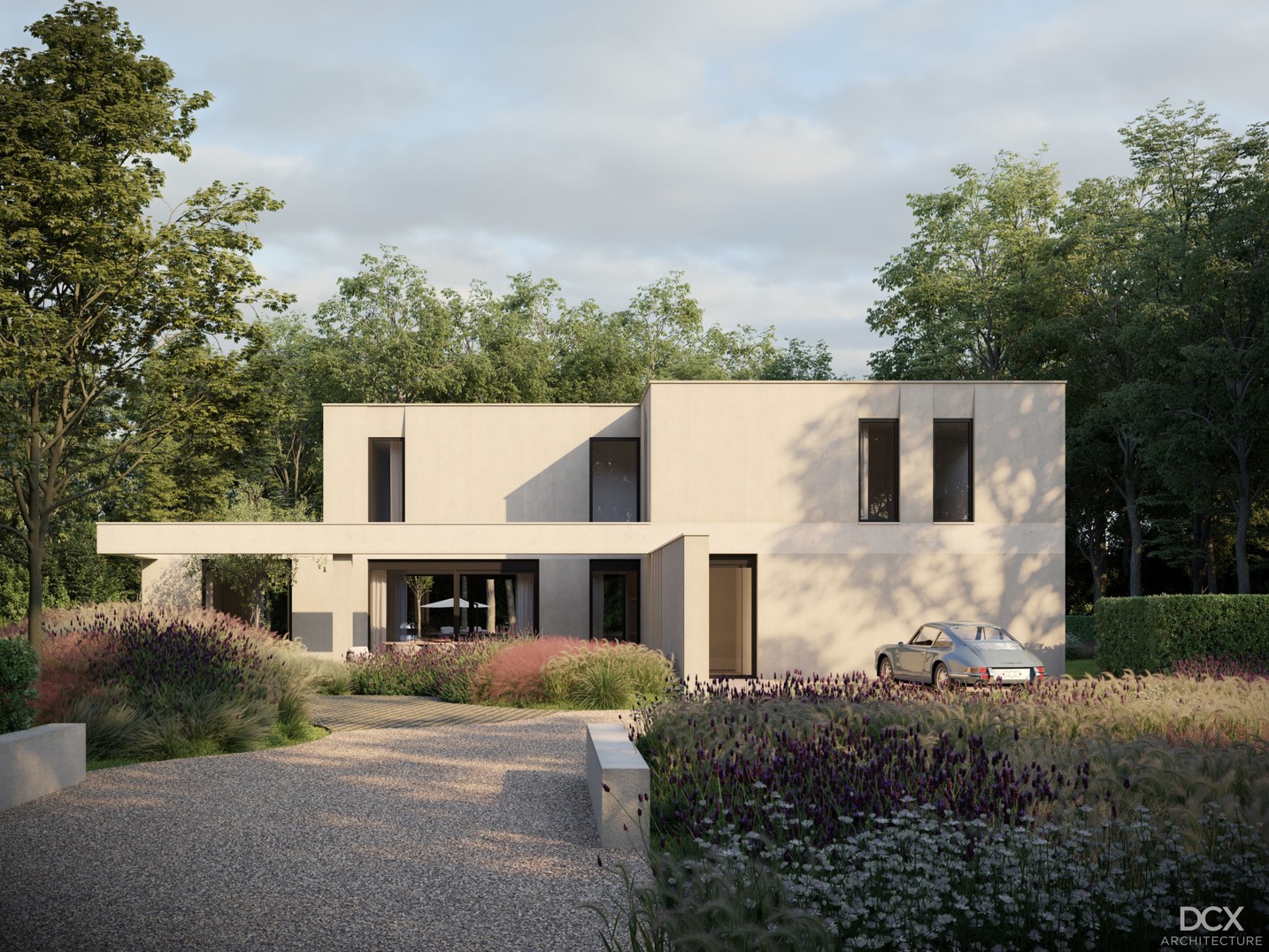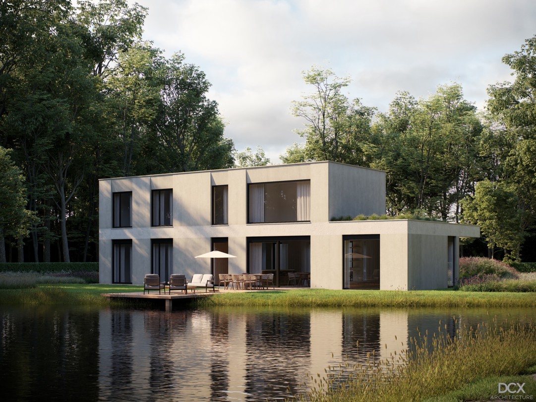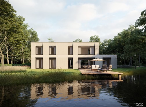 De woning is modern vormgegeven met 2 bouwlagen en een plat dak, voorzien van doorlopende horizontale lijnen, afgewisseld met verticale raampartijen.