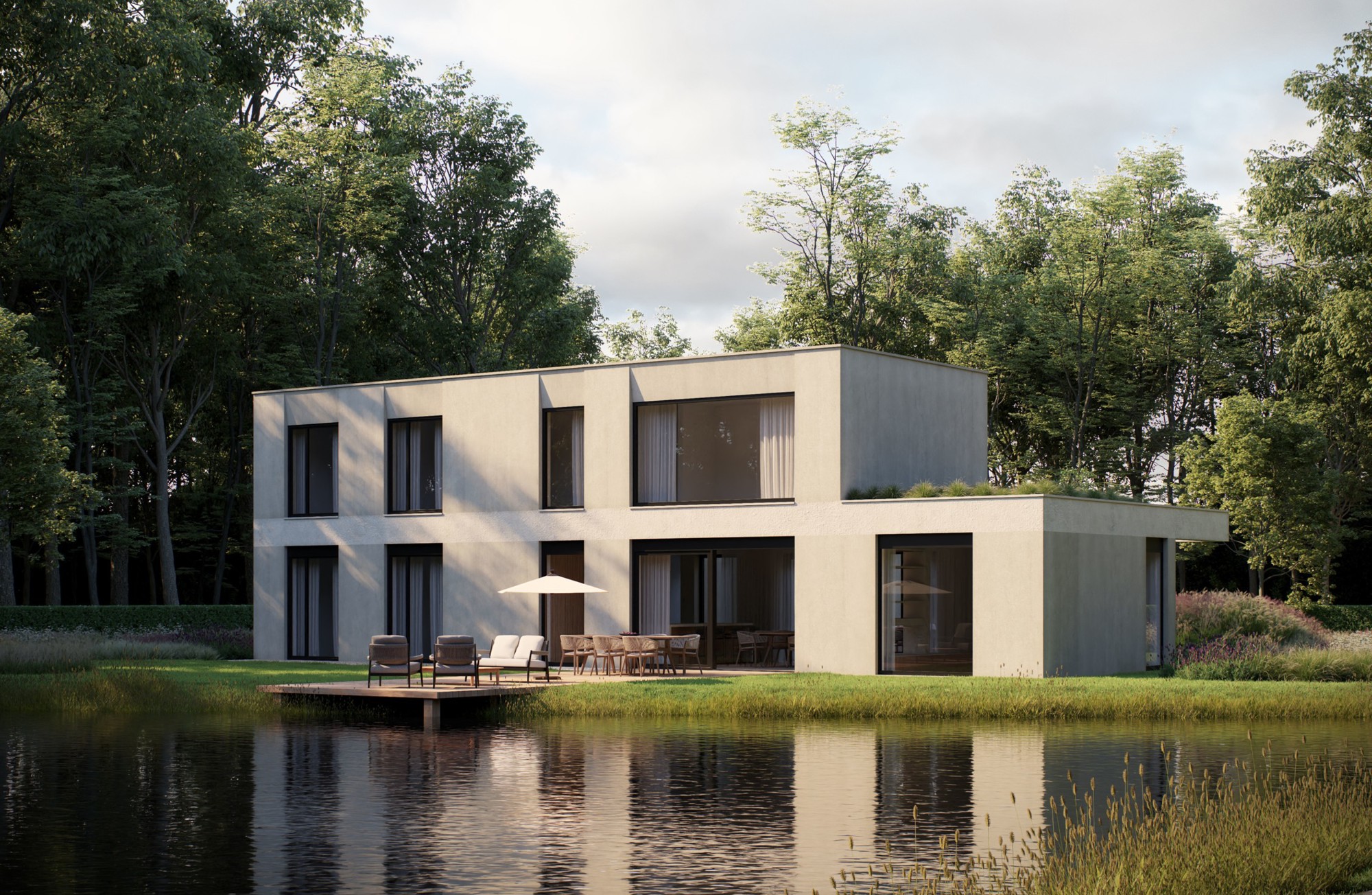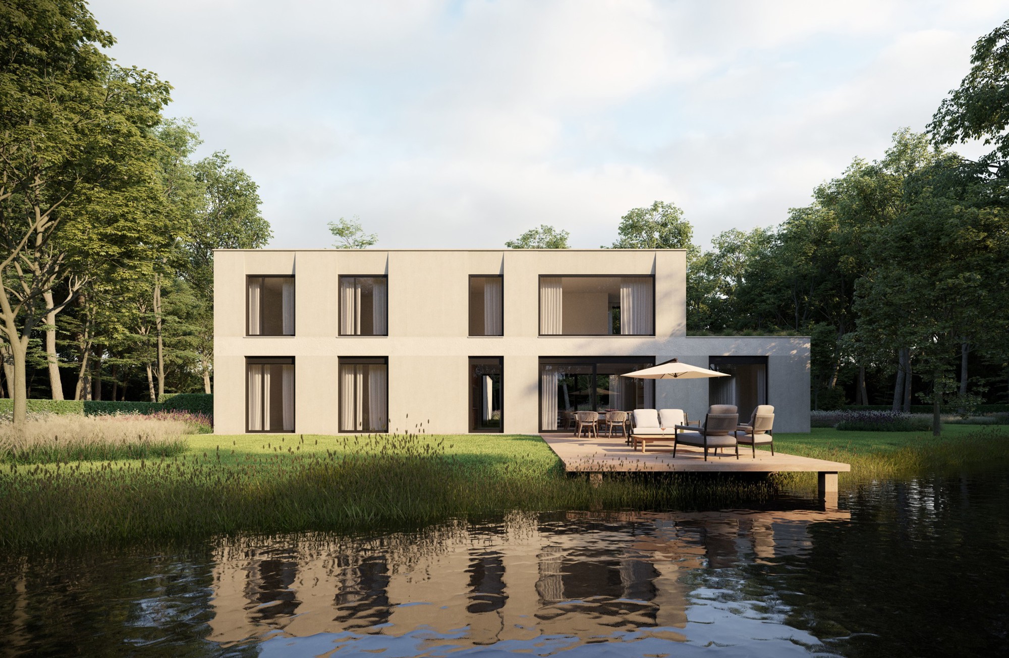 Vanuit zowel het verzonken salon alsook de hoofdslaapkamer ontstaan prachtige gekaderde zichten. Binnen en buiten lopen door met terrassen aan alle zijden.