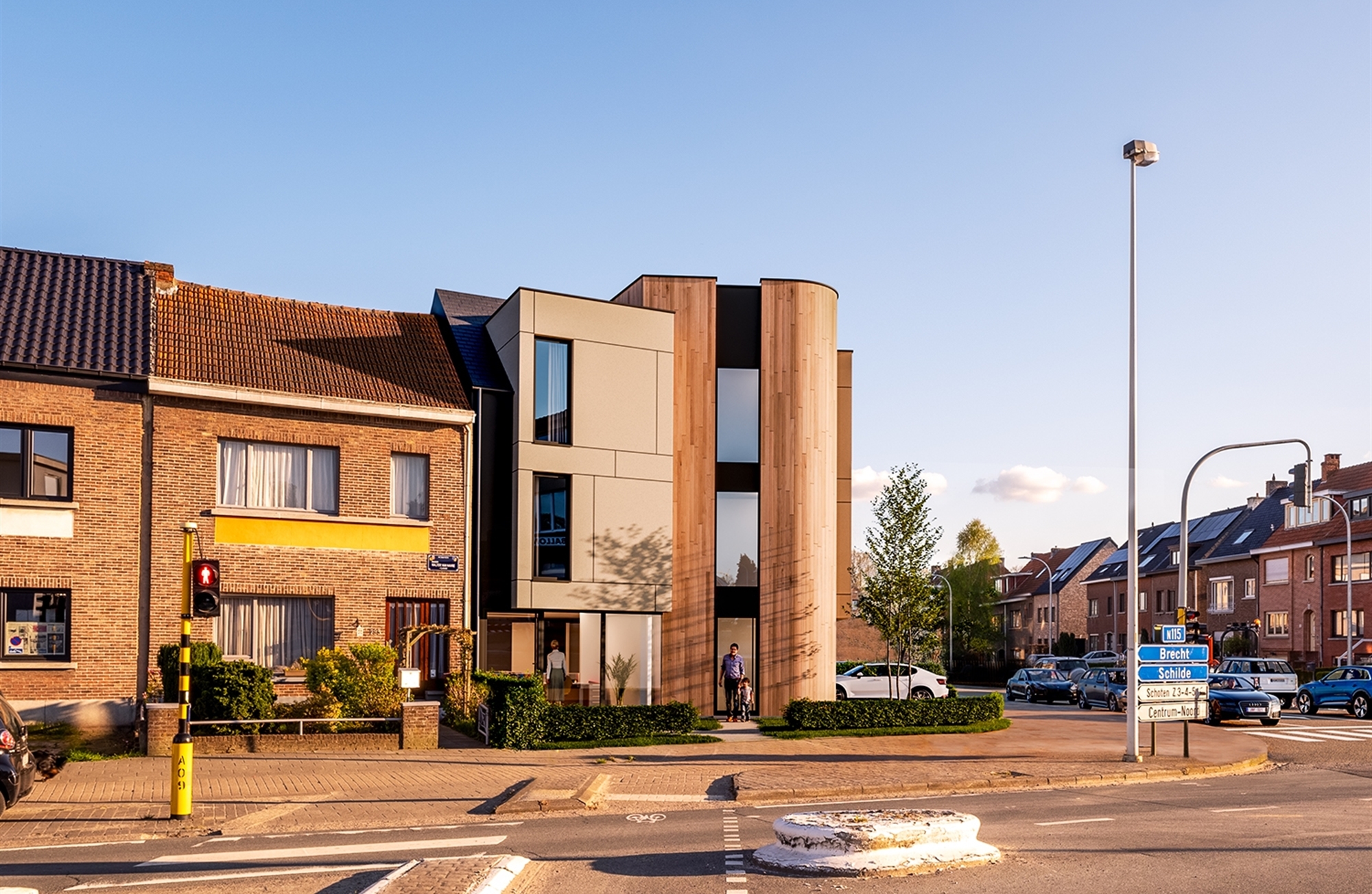Een klein hoekperceel in Schoten krijgt een nieuwe toekomst. Er wordt een commerciële ruimte en appartementen met zonneterras ingericht. Ze beschikken elk over een ruime fietsstalling en eigen garage. De voortuin wordt volledig groen ingericht en ondanks de kleine ruimte wordt een nieuwe boom ingeplant. De circulatiekoker wordt niet verstopt maar juist als sculptuur/eyecatcher voorzien op de hoek, aangevuld met een rijke gevelmaterialisatie.