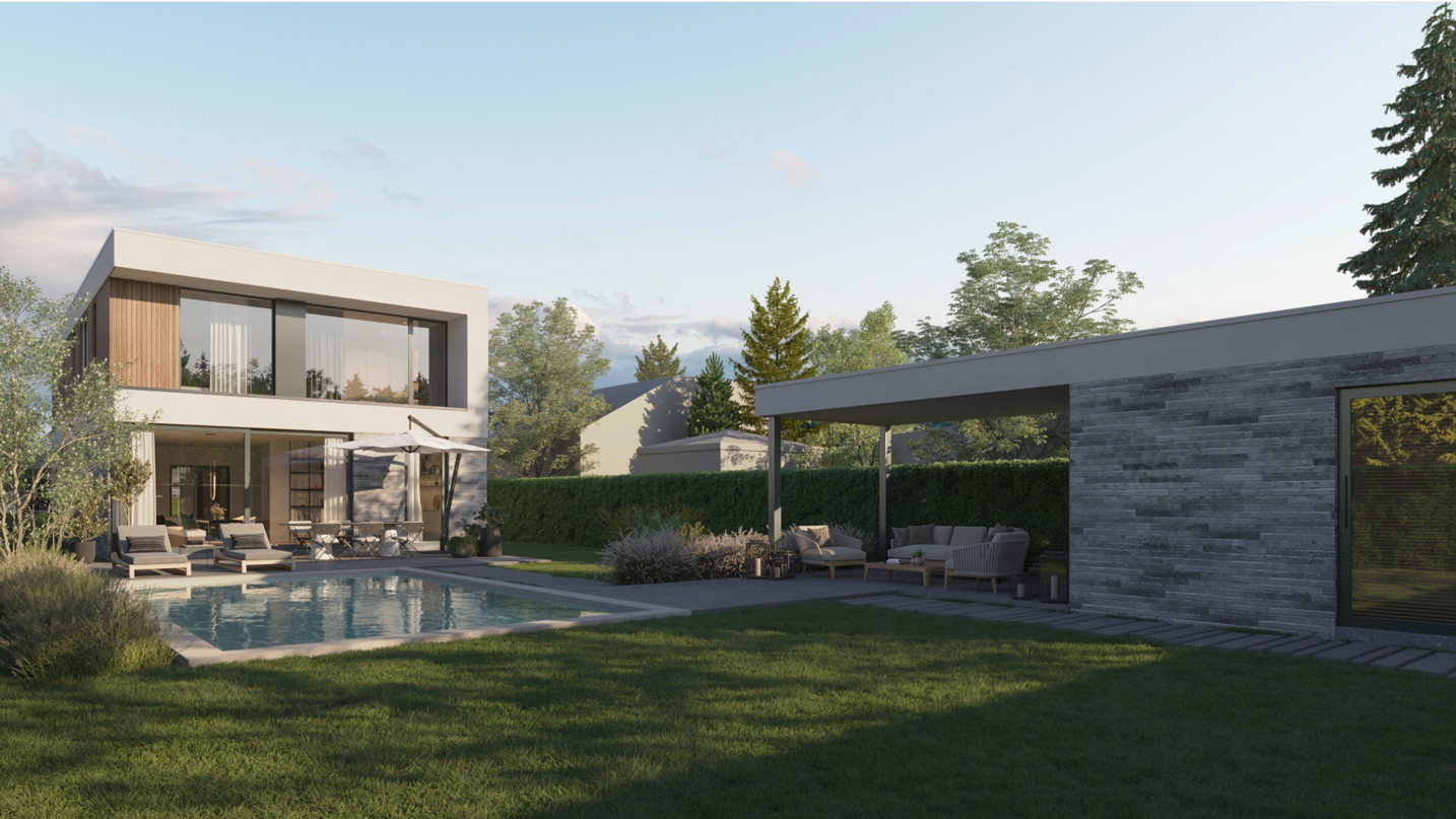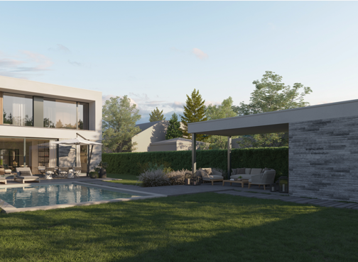 Het architecturale concept wordt ook doorgetrokken naar het poolhouse en de aansluitende leefterrassen met zwembad.