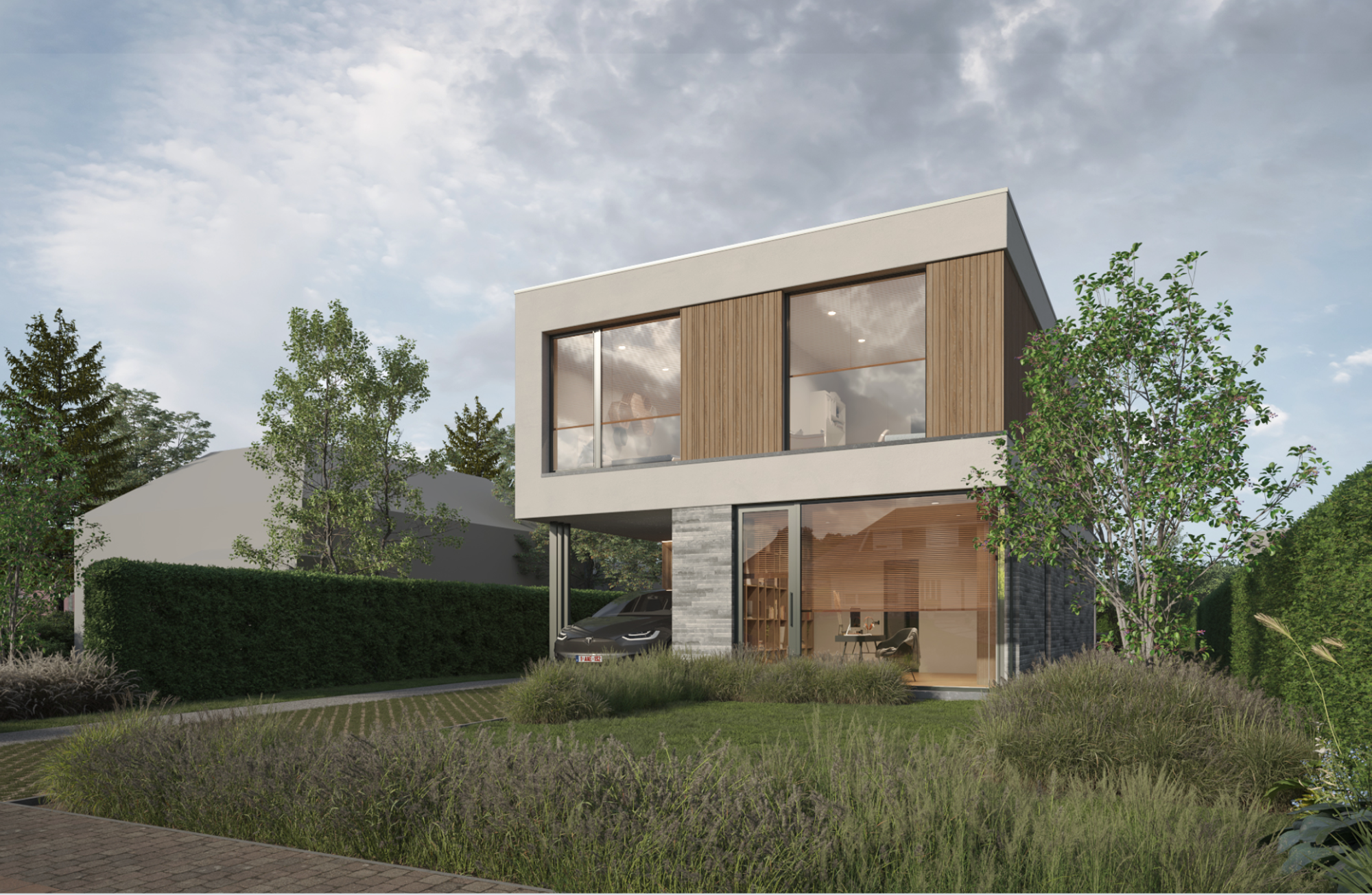 Vrijstaande nieuwbouwwoning te Heist-op-den-Berg, opgevat als een stenen sokkel met strakke U-vorm in gevelpleister als bovenverdieping. De houten beplanking als accent voegt warmte toe aan de woning die voorzien is van grote verticale raampartijen aan alle zijdes.